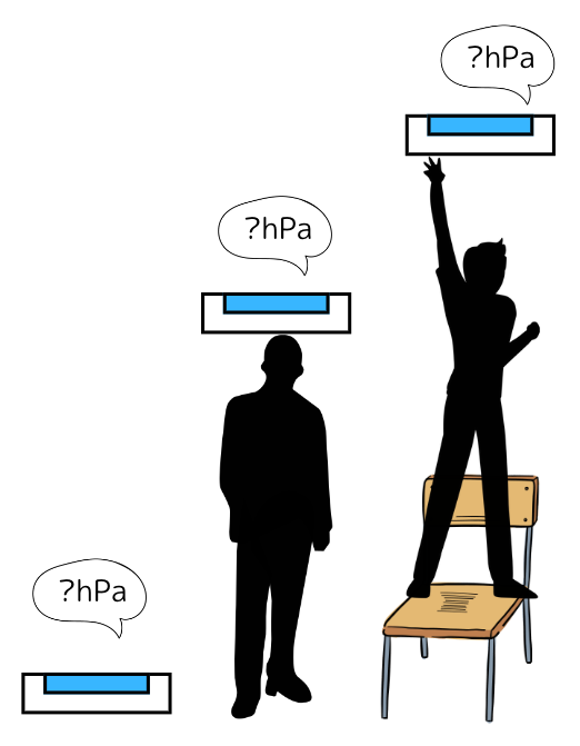 - 次に、椅子または机にのり、AkaDako探究ツールをできるだけ高い位置に持ち上げ、気圧を測定する。